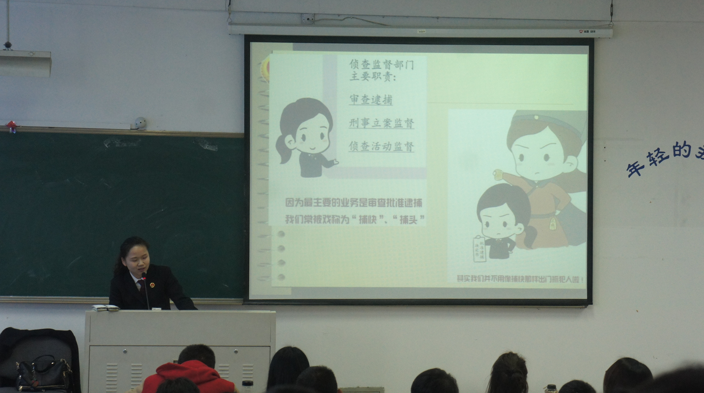 姚检察官讲座的题目是《2016审查逮捕相关规定之解读》,她首先告诉同学们侦查监督科是干什么的,她归纳为"三项职责八项任务",并用《最炫侦检风》的歌词生动形象地给大家演示这些职责如何落实,引来大家阵阵笑声;接着,姚检察官问大家逮捕的条件是什么?如何理解?学生们站起来谈谈自己对逮捕条件的理论理解,姚检察官结合自己的实际对学生的理解予以点评,并从刑诉法规定、司法解释多个角度阐释实务工作中对逮捕证据条件、刑罚条件、必要条件的审核办法,讲解详实具体,逻辑严密,让大家可以切实把握逮捕的审查条件;最后,姚检察官又补充讲授了逮捕中非法证据的排除、讯问犯罪嫌疑人、录音录像的审查等。