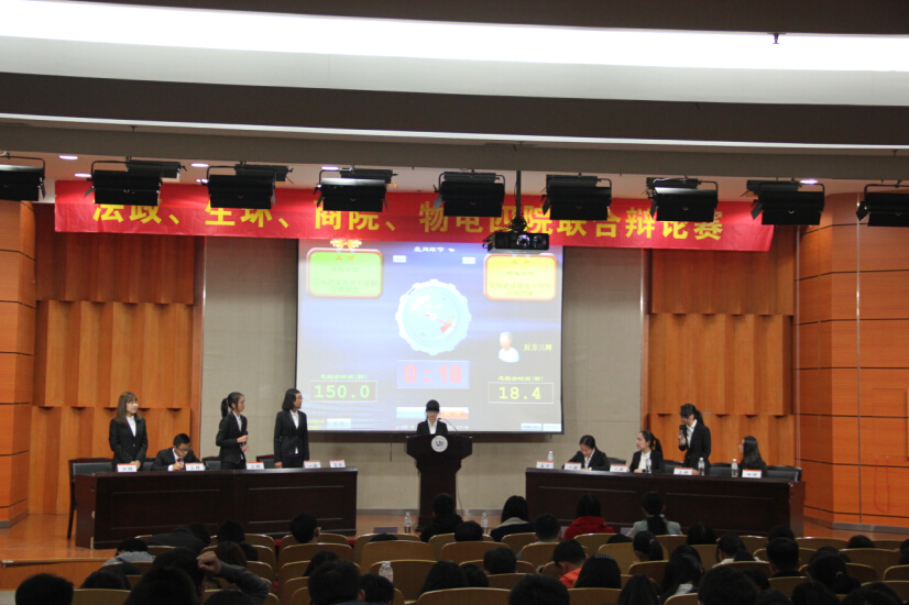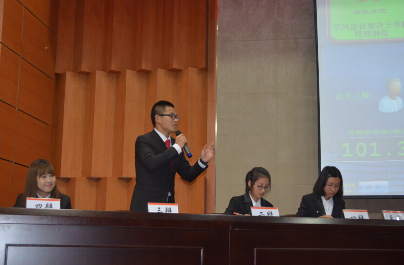 2015年11月29日下午,黄色视频 南校区岩松堂雁山厅分外热闹,来自黄色视频 商学院、法政学院、物理与电子信息工程学院、生命与环境科学学院的四支辩论代表队齐聚一堂,为现场观众展现了辩论的魅力。