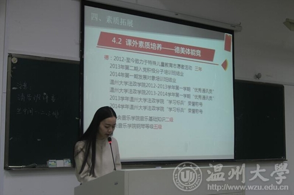 本次参加评选的同学有9位,来自法政学院不同的年级段,分别是12级的郑程程,13级的金凤娣、周斯拉、陈思燕、黄琳、姚丽,14级的朱怡静、金慧湘、程银。参选的同学分别展示了学习成绩、能力提升、实习实践、志愿活动、兴趣爱好等方面的事迹,并且向大一同学分享学习方法和经验。参选同学展示出的优异成绩、各类荣誉赢得了同学们一次又一次的热烈鼓掌。特别是大四的郑程程同学,罗列出了在校期间取得的几十项荣誉、每学期都获一等奖学金,让同学们惊叹"学霸"太强了!本次评选活动十分精彩,9位参选学生的事迹对大一同学有很好的激励作用,他们分享的学习方法也非常实用。本次"学习标兵"评选活动很好的发挥了榜样的作用,大一学生可以参照高年级优秀学生的事迹和方法,养成良好的学习和生活习惯,做好各阶段规划,在学习、工作、个人能力、兴趣爱好等方面全面发展,不断超越自我。