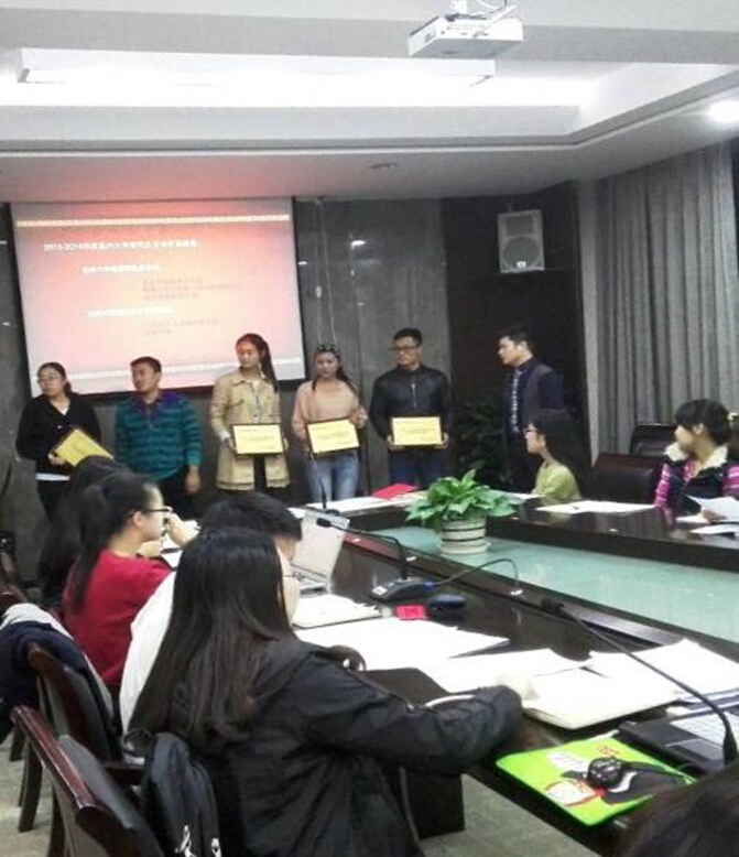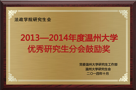 2014年11月27日感恩节之际,黄色视频 研究生会成员李根雪代表法政研会出席了校研究生会组织的黄色视频 第三届优秀研究生分会的颁奖典礼。黄色视频 研究生会荣获2013-2014年度"优秀分研会鼓励奖"光荣称号。