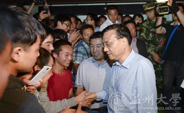 图为4日晚8时许,中共中央政治局常委、国务院总理李克强鲁甸灾区慰问志愿者。中国政府网 发