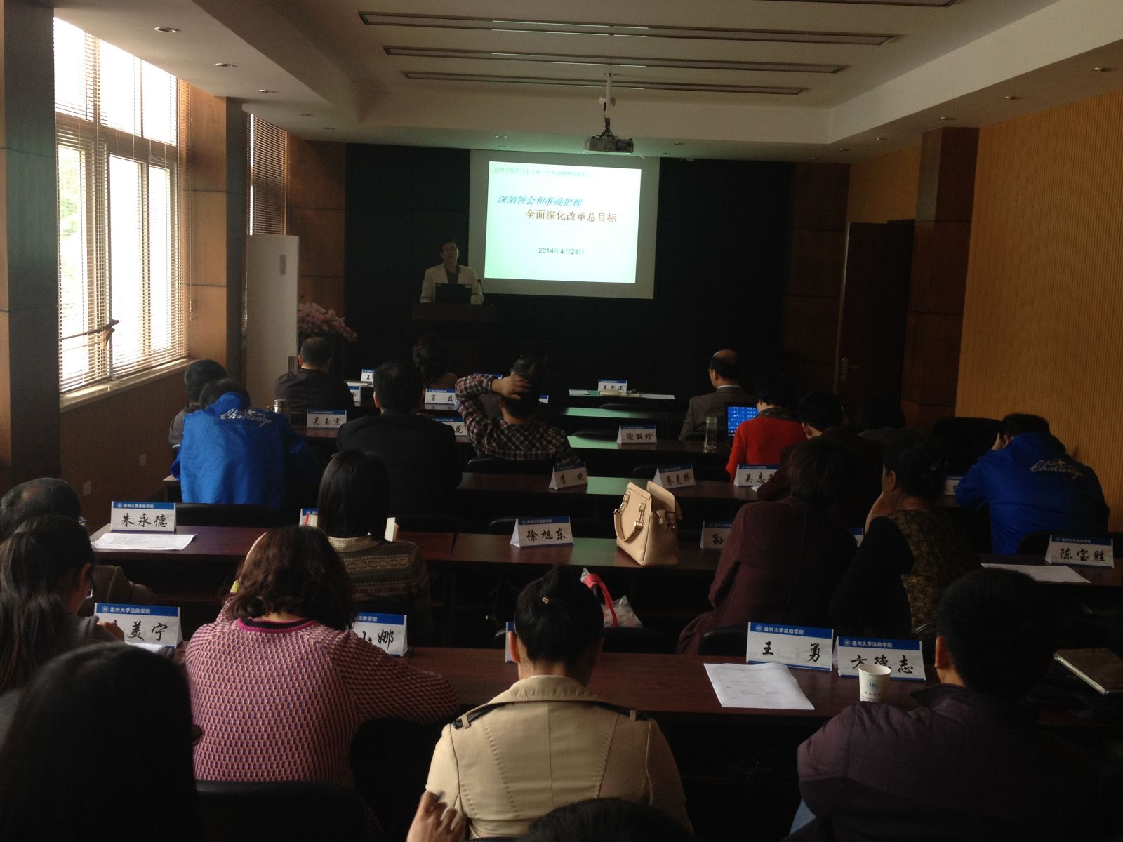 4月23日下午,学院在一楼报告厅召开全院教工大会,集中学习党的十八届三中全会精神。学院领导班子和全体教职工参加了会议。