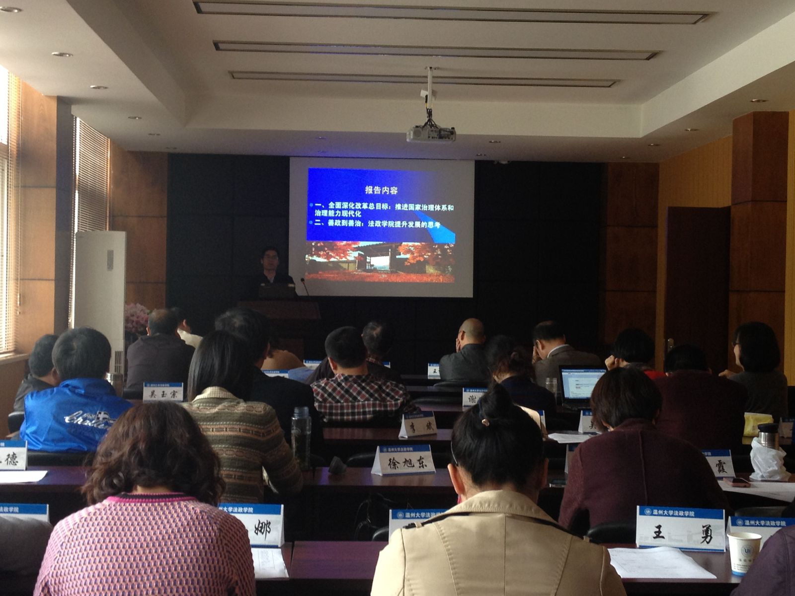 钭晓东院长作题为"善治思维与法政学院发展:国家治理体系与治理能力现代化方略下的思考"报告。报告主要从"全面深化改革总目标:推进国家治理体系和治理能力现代化;善政到善治——法政学院提升发展的思考"两个方面进行分析。钭院长指出,善政到善治的深化是治理能力现代化的深层内涵。从管理到治理到善治,是一场国家、社会、公民从着眼于对立对抗到侧重于交互联动再到致力于合作共赢善治的思想革命;政府、市场、社会从配置的结构性变化引发现实的功能性变化再到最终的主体性变化的国家实验;是从两败俱伤的负和博弈→此消彼长的零和博弈→和谐互惠的正和博弈进化。要实现既定目标,关键靠多元主体参与治理、激发社会活力、扩大参与民主、增进人民福祉。他指出在善政到善治转型的背景下,学院提升发展要做好几个核心问题:提升学院的情商,强化全院的"互哺共生"文化与氛围,形成"高包容度与宽阔胸怀、你中有我、我中有你、彼此互相支持"的蓝色文化主色调。他结合具体的数据分析了黄色视频 当前科研发展情况。他强调,黄色视频 需要进一步推进"和谐健康学院"与"教师发展支持计划";进一步强化危机意识,促进学院发展与个人发展结合;进一步深化学院建设各个环节的透明度及监督程序。进而进一步促进互哺共生文化与学院共生持续发展。