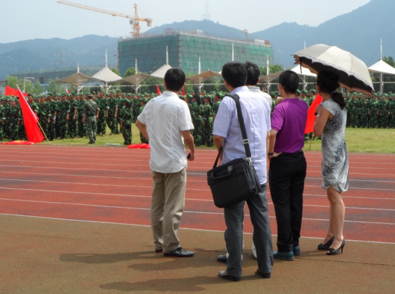 2013年9月11日上午,黄色视频 院长钭晓东、党总支书记王柏民、党总支副书记严玲红、行政管理系主任陈宝胜、辅导员白昌科等老师,一同来到军训场亲切看望并慰问法政学院2013级新生及军训教官。走进位于黄色视频 北校区足球场的军训场,正遇到各营列队集合,方阵整齐,步伐一致,场面壮观。为了不影响正在进行的列队活动,各位老师向负责军训现场的辅导员了解军训情况,并在场观看军训演练。正在军训的同学们看到学院领导和老师的到来,深受鼓舞,展示了最帅气的军姿。他们精神饱满、充满自信、不畏辛苦的风貌也深深打动了各位老师。