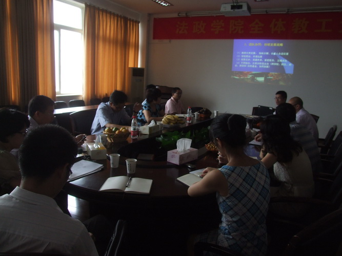 最后,蔡校长作总结讲话。蔡校长在充分肯定学院前几年工作同时,对本学期的工作思路、理念和展望给予了高度赞赏,指出按此思路建设发展,学院建设及发展大有希望,完全可以在学校的人文社科研究及专业发展中发挥重要作用,并就学科、专业、科研、服务地方、人才引进、和师资队伍建设等方面提出了指导性意见。蔡校长指出:人才培养在注重理念建设的同时,扎扎实实地去做好各培养环节的工作也是非常重要,这是学校、教师的基本职责。这也是社会对我们学校人才培养所提要求的重要方面。蔡校长强调:要围绕学校"厚基础、强能力、能创业、会创新、敢担当"的人才培养特色,努力打造法政学院的人才培养特色。教师发展就是学院发展,班子要把教师取得的成绩视为自己的成果。学校也将对学院的人才培养及人才引进给予大力支持。同时,他也勉励学院要抓住机遇,拓宽思路,谋新路、出新招,层层推进、形成合力,开创新局面,实现新跨越。