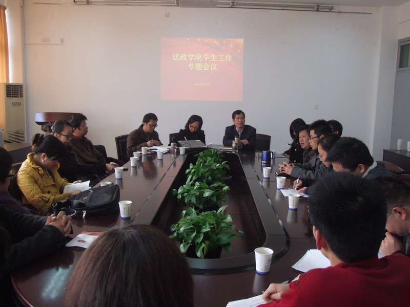 12月14日下午,法政学院召开学生工作专题会议。党总支书记蔡克骄主持会议,副书记严玲红、各班班主任、学生科全体成员参加会议。