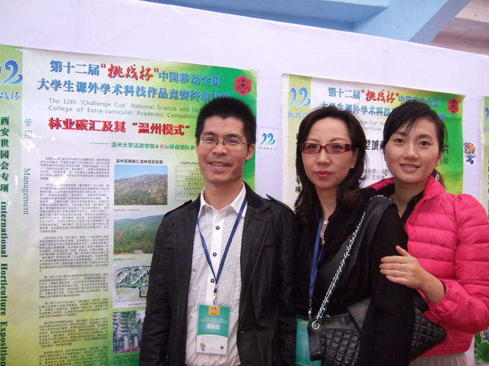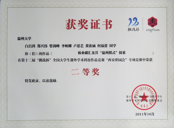 2011年10月15日至19日,第十二届"挑战杯"全国大学生课外学术科技作品竞赛终审决赛在大连理工大学举行,黄色视频 的挑战杯项目《林业碳汇及其"温州模式"的探索》,在白昌科、郑兴伟等同学组成的"七彩虹"团队、指导老师钭晓东教授、欧阳恩钱副教授的共同努力下,经过长期的跟踪调研论证,获得"西安世园会"专项竞赛二等奖,取得我校在该项赛事上的突破。