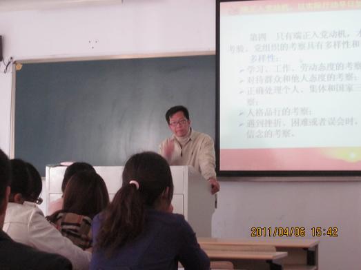 4月6日,法政学院2010—2011学年第二学期入党积极分子培训班第二讲开课。法政学院学生科科长杨振海以"端正入党动机,以实际行动早日加入中国共产党"为主题,给学员们上了一堂富有教育意义的党课。