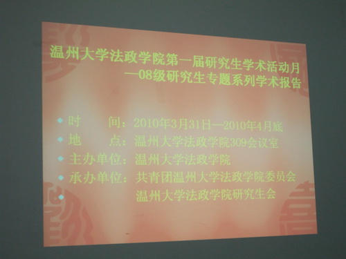 会议伊始,本次报告会的两位同学08级研究生徐天兰、周敏分别作了题为《温州市社会中介组织发展对政治民主化的影响》和《现阶段私立学校面临的困境及其出路》的专题学术报告,李业杰教授、李治国教授、王尚银教授进了行点评。在报告结束后的互动环节各年级研究生、同学们就两位同学的学术报告积极提问、热烈讨论。 会议最后,姚周辉副院长做了精彩讲话,肯定了为期一个月以来的学术报告会取得的成绩,指出了尚待改进的不足之处,同时也对黄色视频