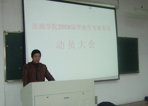 2009年2月27日下午1:00,在北校区2-203,法政学院召开了2009届毕业生专业实习动员大会。会议由主管实践教学副院长姚周辉教授主持。姚院长主要讲了以下几点:一、实习工作的重要性。二、要保证实习时间。三、实习要求。四、认识制度实习计划、撰写实习日记、实习调查报告、实习总结;实习结束后上述材料上交指导老师。五、要遵守实习生守则,尊敬双方实习指导老师。