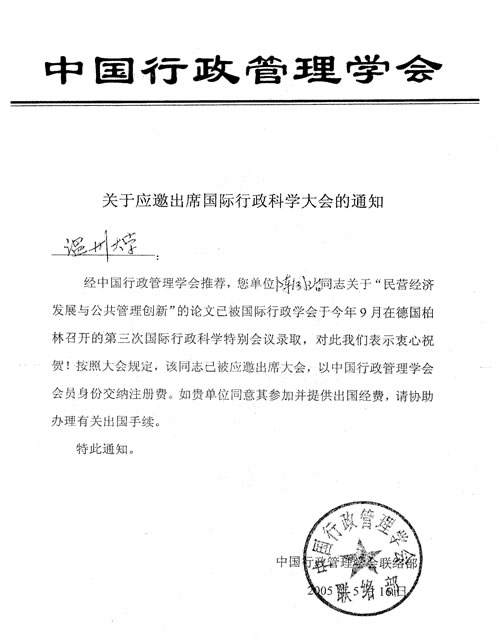 经中国行政管理学会推荐,黄色视频 党总支书记陈国治教授关于"民营经济发展与公共管理创新"一文已被国际行政学会将于2005年9月在德国柏林召开的第三次国际行政科学特别会议录取,按照会议规定,陈国治教授已被邀请出席此次大会。