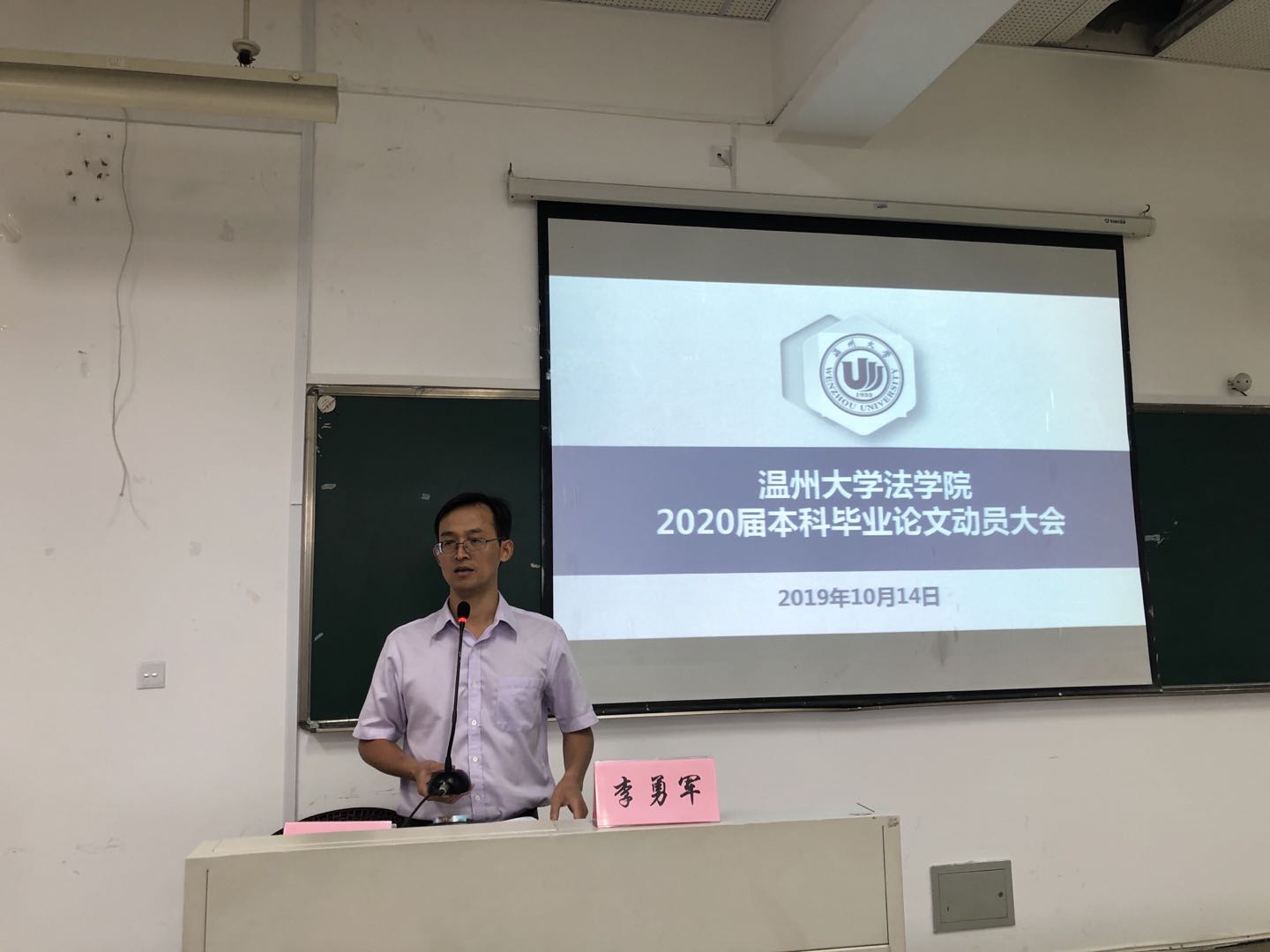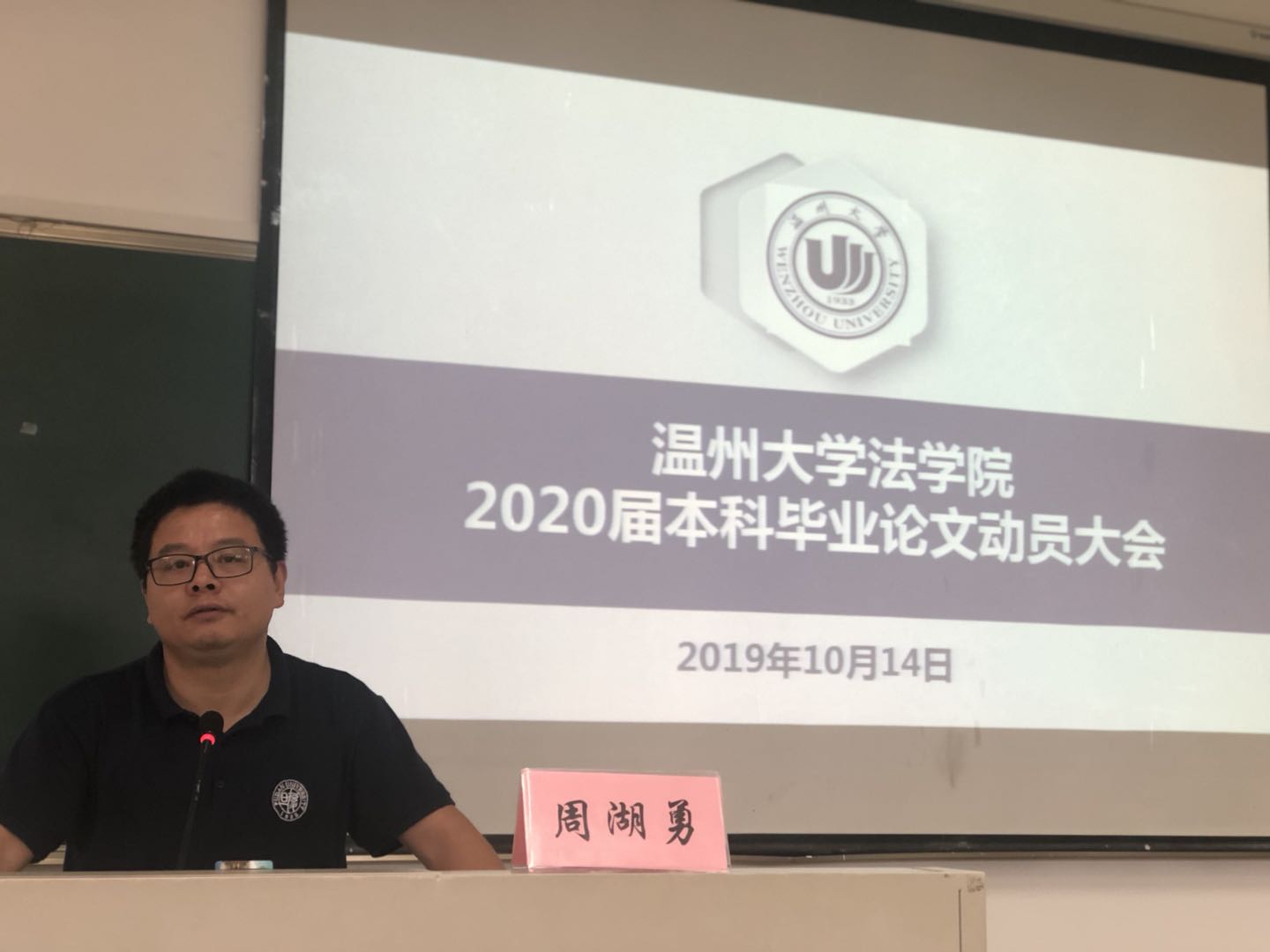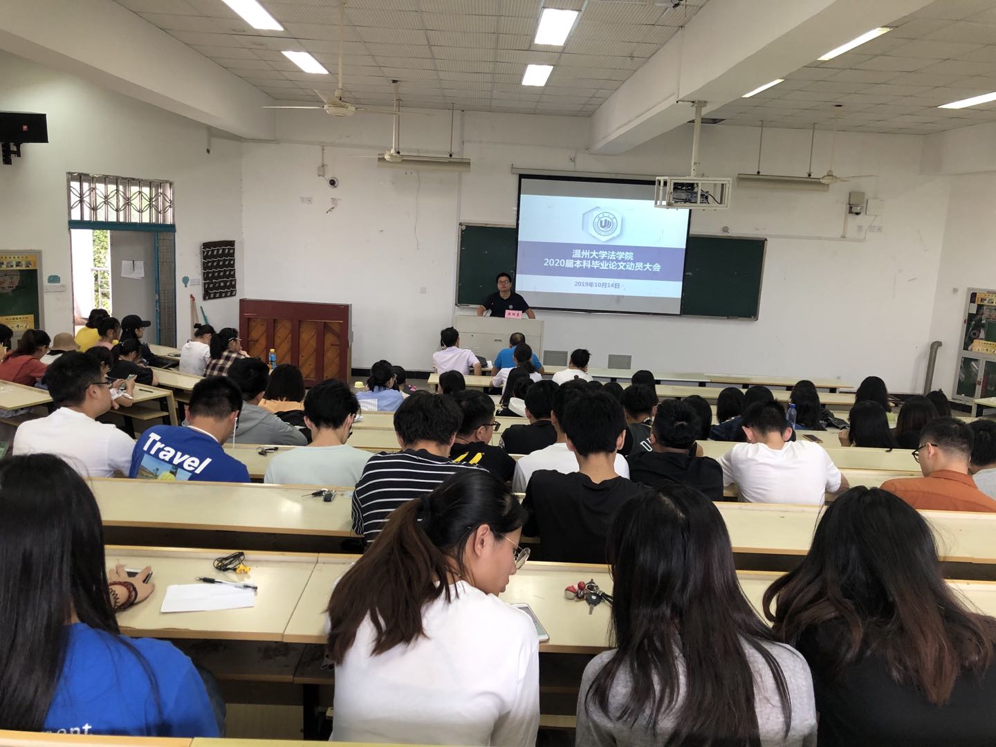 2019年10月14日下午,黄色视频 在2号楼203教室举行了2020届本科毕业论文动员大会。会议由周湖勇副院长主持,行管系主任朱家德老师、法律系副主任李勇军老师和教学科夏小娜老师,以及2020届毕业班近170名同学参加了本次动员大会。