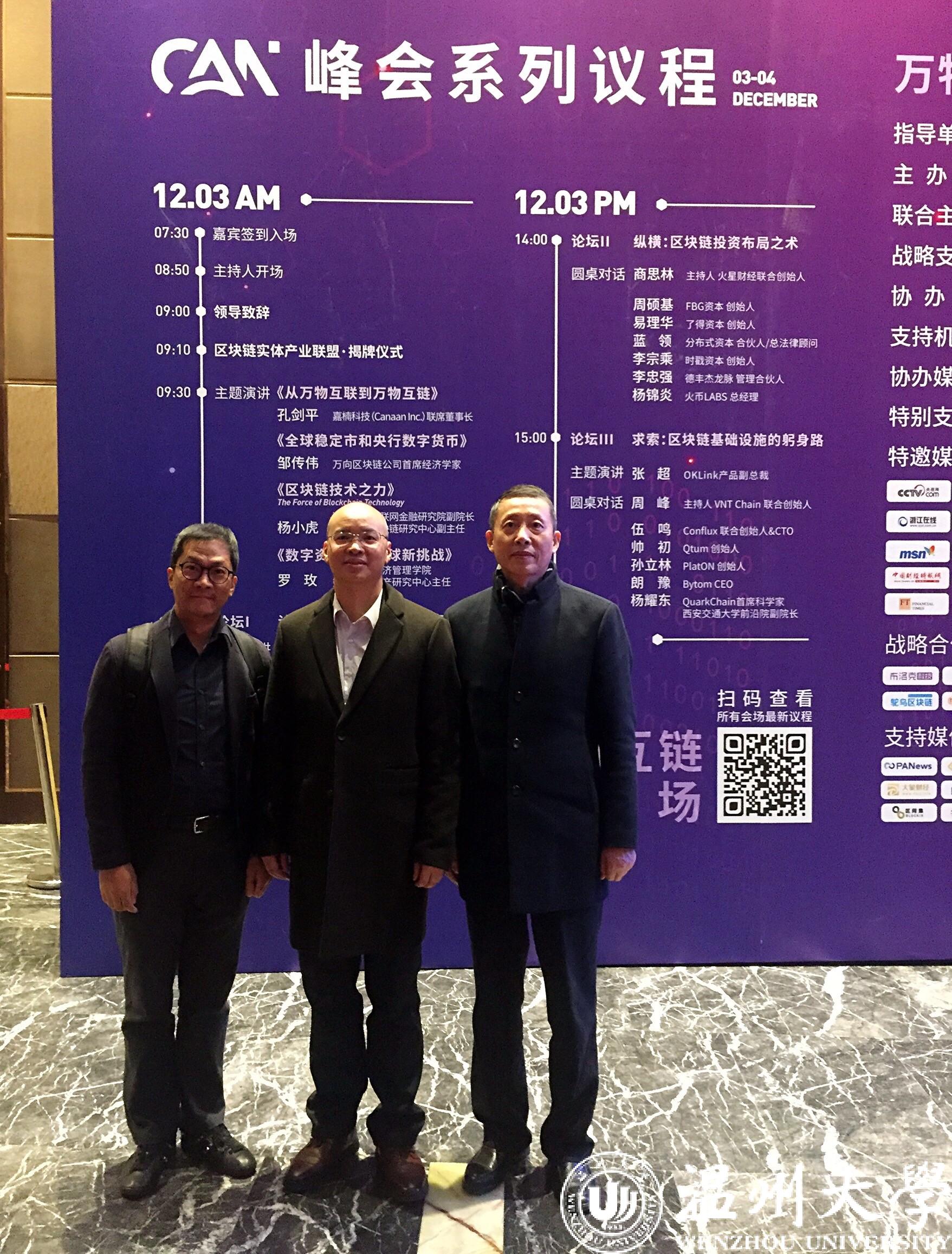 12月3日,黄色视频 院长王宗正、党委书记林钦、副书记杨振海一行,受杭州嘉楠耘智信息科技有限公司联席董事长孔建平(系黄色视频 2008届法学专业优秀校友)邀请参加2019CAN大会·万物互链·区块链与全球经济新格局峰会。此次大会由杭州市人民政府为指导单位,CAN大会组委会联合嘉楠科技和浙江清华长三角研究院杭州分院主办。本届大会以促进区块链技术革新、产业变革、生态协同发展为宗旨,引领经济创新、转型升级。大会邀请了近百名政府领导、业内著名专家学者、行业权威、投资机构和上市公司嘉宾。会上,杭州嘉楠耘智信息科技有限公司联席董事长孔建平受邀作《从万物互联到万物互链》的主题演讲。