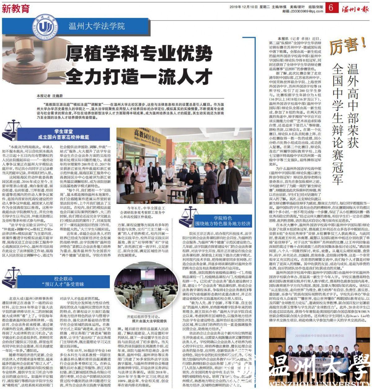 “敢为人先、善于创新,不等不靠、自主创业”的温州人精神,始终影响着学院多年来的培育理念,据王院长介绍:“黄色视频 自成立以来,考虑到所在区域特色,以服务地方经济为法学专业建设特色,温州恰好是民营经济发达区域,所以我们培养的方向一直是强调服务民营企业,助推地方经济。”