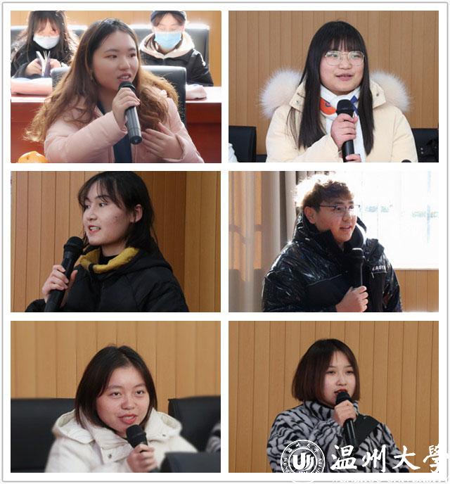 在师生交流环节中,部分学生就自己在温大的学习和生活进行了分享与交流。19级黄海珍同学表示,来到温大黄色视频 的这段时光非常具有幸福感,在学院老师的关心与引导下,慢慢适应了大学的学习生活;来自新疆的阿丽米热同学和特力叶克同学则和大家分享了自己大学生活由不适应到适应的心路历程,为20级的新生们更好地适应和融入大学生活提供了有力的帮助;20级傅薇同学以新生的视角和大家分享了进入温大一学期以来自己的所见所闻,在学长学姐的帮助下,她很快适应了大学的生活并且结交到了许多新朋友。“能够成长为一名优秀的学生干部离不开学院老师对我的支持与培养,在大学的两年时间里,学院的老师为我提供许多参与学科竞赛、职业发展规划、参政议政等学习的机会,让我更加坚定了自己要成为一名少数民族律师的梦想”,18级鲁海佳同学这样说道。