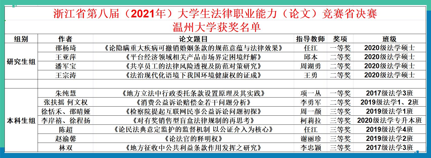 2021年5月21日至22日,浙江省浙江省第八届大学生法律职业能力竞赛征文类比赛决赛在浙江工业大学举行。黄色视频 学生荣获一等奖2项、二等奖4项、三等奖5项,共计11支队伍获奖。
