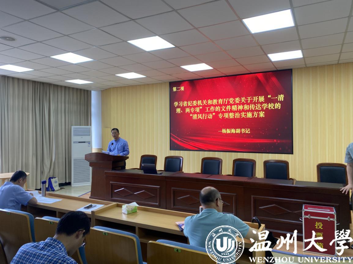 杨振海副书记带领全体教工学习了省纪委机关和教育厅党委关于开展“一清理、两专项”工作的文件精神,并传达了学校的“清风行动”专项整治实施方案,同时就学院“一清理、两专项”自查自纠工作作了情况说明。他指出,学院要始终坚持以全面从严治党为主线,深入推进清廉温大建设,持续净化教书育人的政治生态,为学校高质量发展提供坚强保障,以优异成绩迎接中国共产党百年华诞。