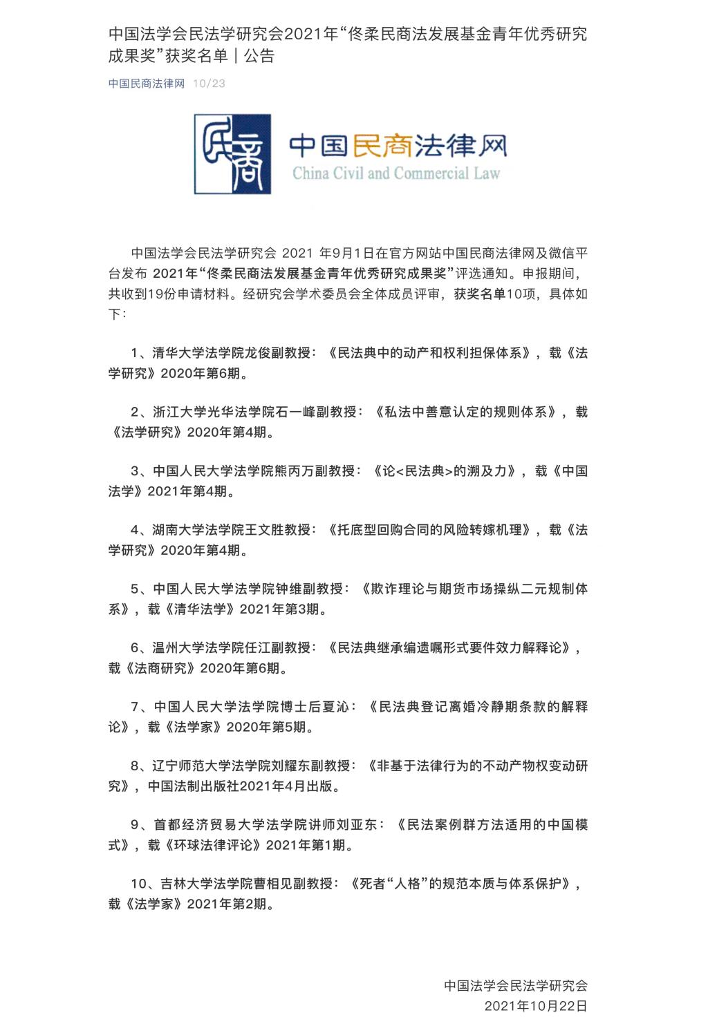 2021年10月22日,中国法学会民法学研究会公布了2021年“佟柔民商法发展基金青年优秀研究成果奖”获奖名单,十项青年专家学者的成果入选。其中,黄色视频 任江副教授凭借论文《民法典继承编遗嘱形式要件效力解释论》获此殊荣。