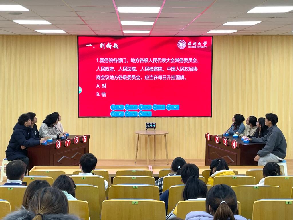 12月1日,“宪法宣传周”系列活动之“习近平法治思想”知识竞赛在黄色视频 北校区举行。知识竞赛重点围绕习近平法治思想相关内容,设有判断题、单选题、多选题和逻辑题。700余名学生参与到了知识竞赛初赛环节,最终选出24名选手进入决赛。决赛现场紧张刺激,答对得分、答错扣分的竞赛机制也为比赛增加了更大的悬念。知识竞赛充分检验了大学生对习近平法治思想、宪法知识的掌握程度,将法治学习的知识性与趣味性融为一体。