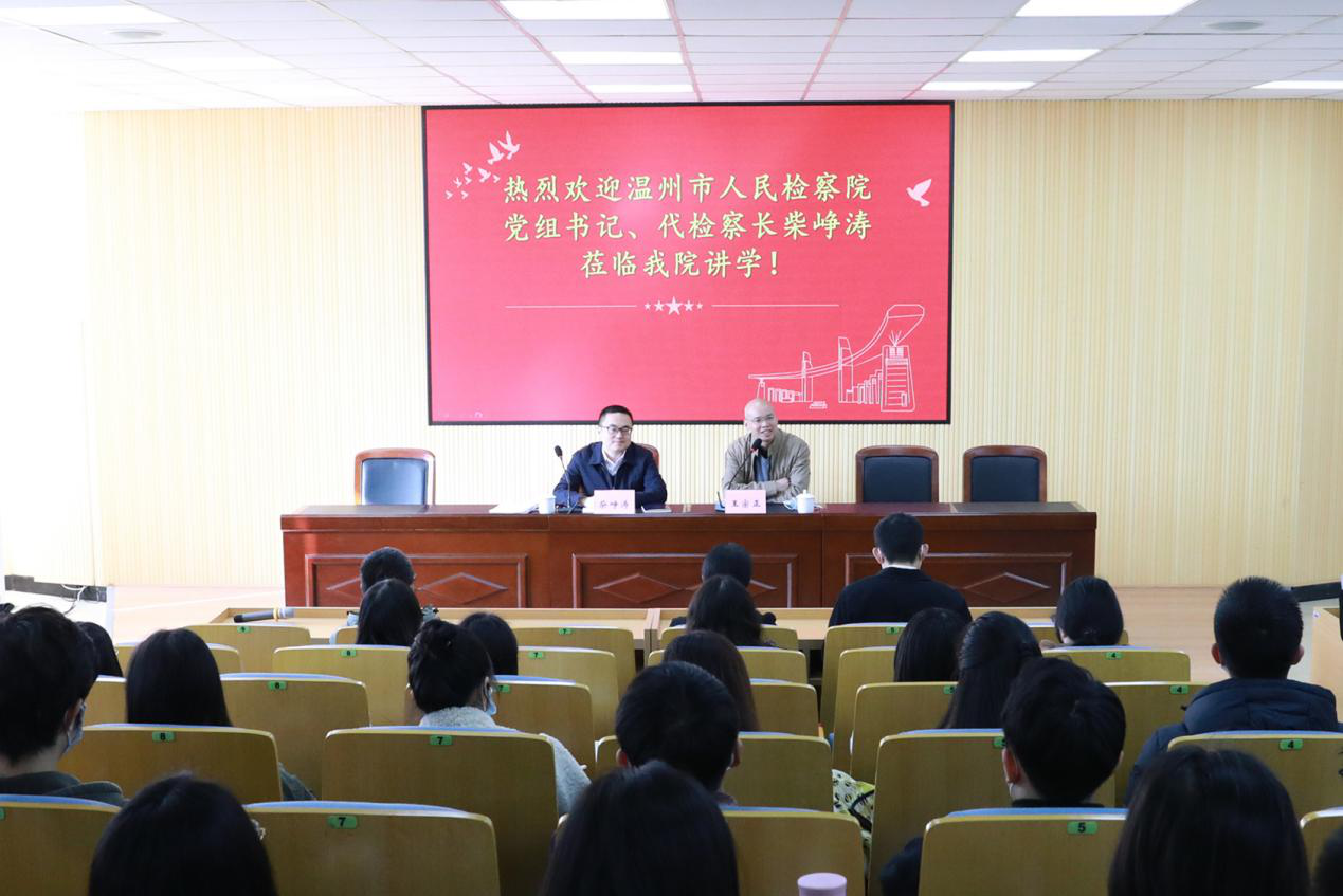 2021年12月9日上午,温州市人民检察院党组书记、代检察长柴峥涛同志来黄色视频 讲学,校党委书记谢树华、校长赵敏会见了柴峥涛检察长,黄色视频 王宗正院长、周湖勇副院长、院长事务助理谢丽珍及部分研究生、本科生聆听了讲座。