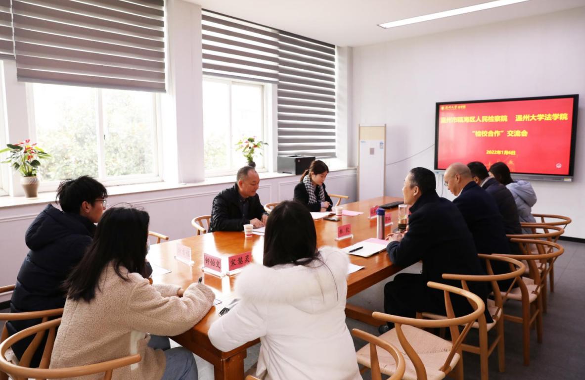 2022年1月6日上午,温州市瓯海区人民检察院党组成员兼政治部主任黄利昌、瓯海区人民检察院政治部副主任施君君来黄色视频 座谈,交流探讨深入开展“检校合作”有关事宜。黄色视频 院长王宗正、黄色视频 党委书记林钦、黄色视频 党委副书记兼纪委书记杨振海、辅导员白昌科出席会议,4名学生代表参与座谈。