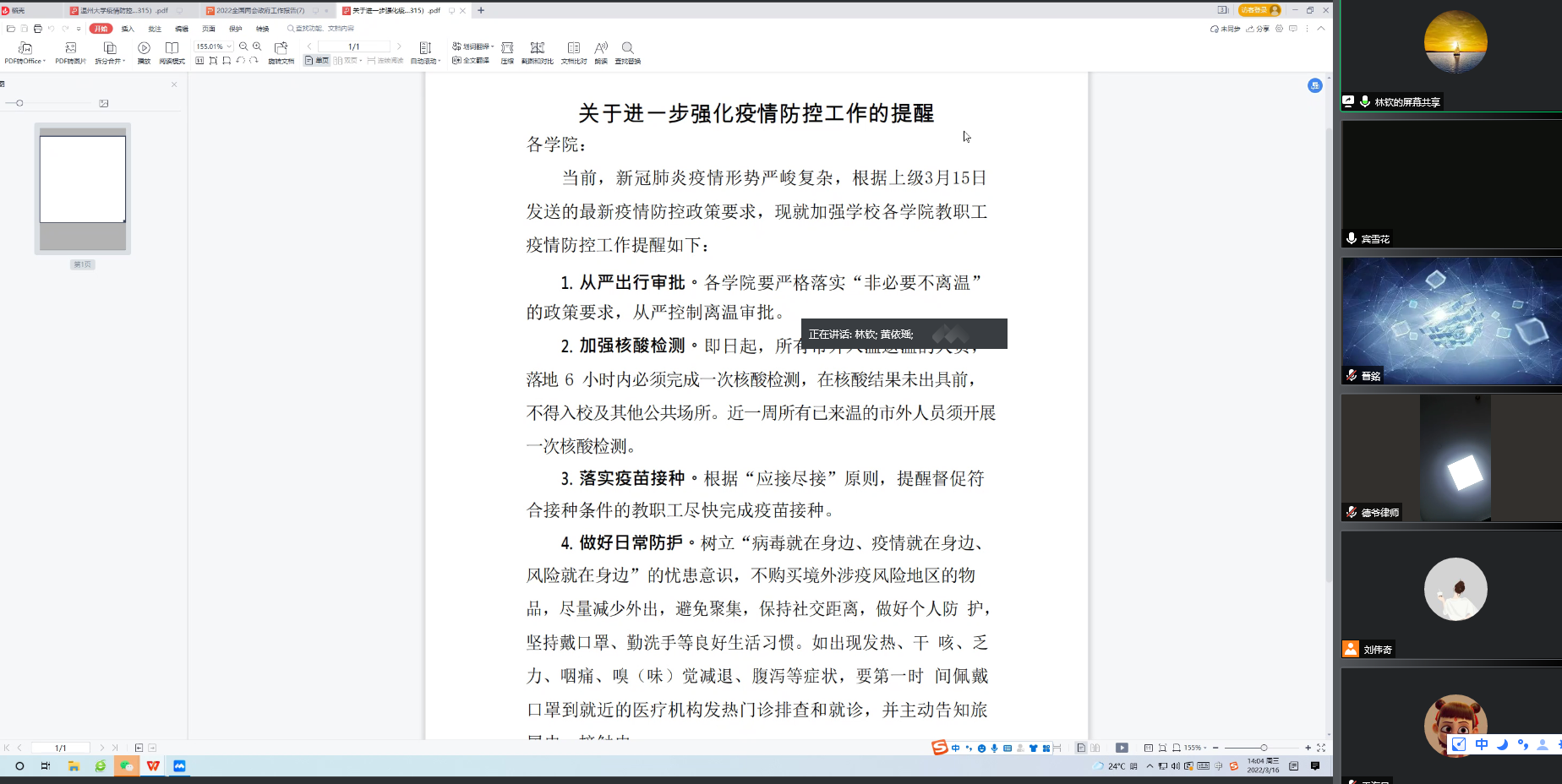 会上,林钦还就学院疫情防控工作作部署,进一步宣传学校关于疫情防控工作的相关文件和通知。他指出,目前全国疫情呈现多点发生、局部暴发的态势,这给疫情防控工作带来更大挑战,也要求大家要继续抓好常态化疫情防控。打赢疫情防控这场持久战需要大家共同努力,老师们应当尽早完成疫苗全程接种和加强免疫接种,建立可靠有效的免疫屏障,学院教师“非必要不离温”,严格出行审批,加强核酸检测,做好日常防护,坚决落实“双检”制度。