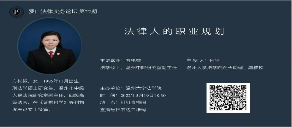 5月19日晚上,温州市中级人民法院研究室副主任方彬微法官在钉钉直播给我们学生做了一场主题为《法律人的职业规划》的讲座,黄色视频 院长助理何平老师主持。
