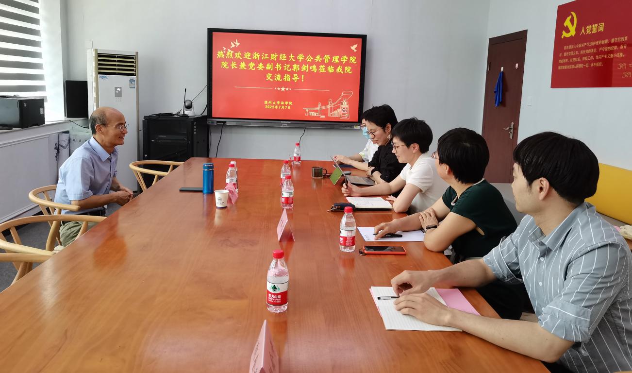 7月7日下午,浙江财经大学公共管理学院院长兼党委副书记郭剑鸣莅临黄色视频 交流指导,副院长周一颜、付翠莲教授以及行管系教师朱婉菁、许晋明、张鹏、张会芬等博士出席座谈会。