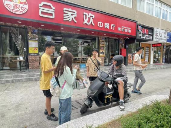 第二分队前往了茶山镇的社区城市驿站,走访了沿路的快递驿站,随机访问了路上的外卖小哥,对新型业态工作者,以及他们的休息、劳动保障有了初步的认识。社区城市驿站设施较新,备有基本的饮用水、藿香正气丸以及休息场所,但是我们注意到,在内休息的多为志愿者,少有外卖员、快递员等;药品包装较新,使用次数应该不多。我们进一步走访了门口的外卖小哥与各个快递站的快递员,邀请他们填写了问卷。在对他们进行简单访问后,我们了解到,他们一天的工作时间基本在八小时以上,但是为了省时高效,基本上不会去沿路设置的驿站休息,并且其中绝大部分参与调研的人,都不知道有可以供他们进行休息的城市驿站的存在。除了一些直接隶属于公司的快递员,有很多人为加盟人员,或是临时的兼职人员,他们有基本的保险,但是多为自己参保。