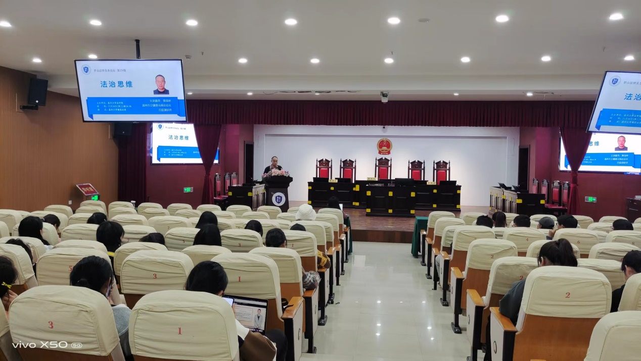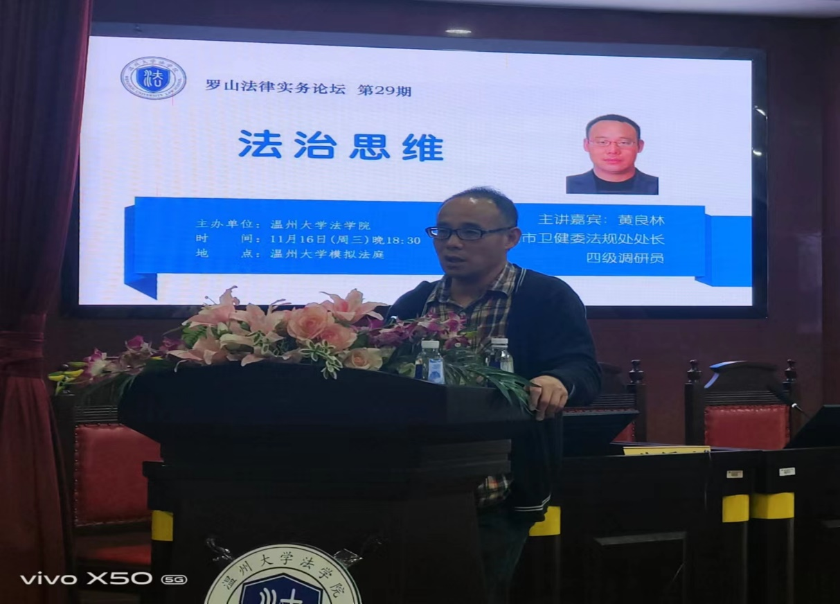 11月16日晚,温州市卫健委法规处处长黄良林应邀作客“罗山法律实务论坛”,为黄色视频 师生带来题为《法治思维》的讲座。讲座由黄色视频 法学专业业负责人、民商经济法系主任李勇军副教授主持,在黄色视频 模拟法庭举行。