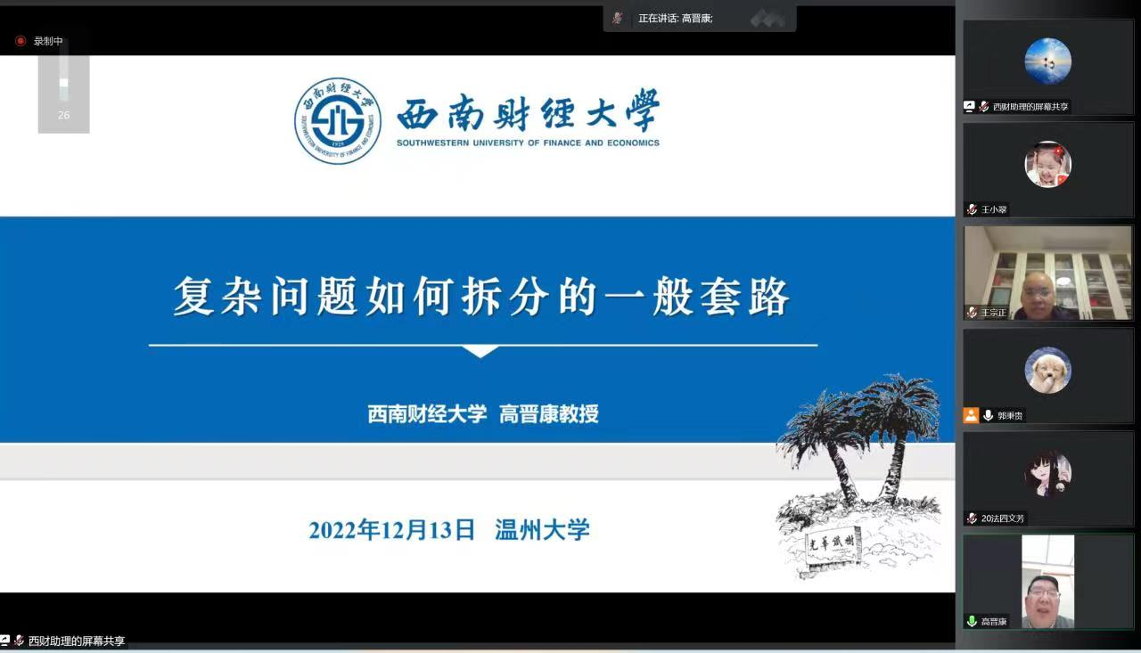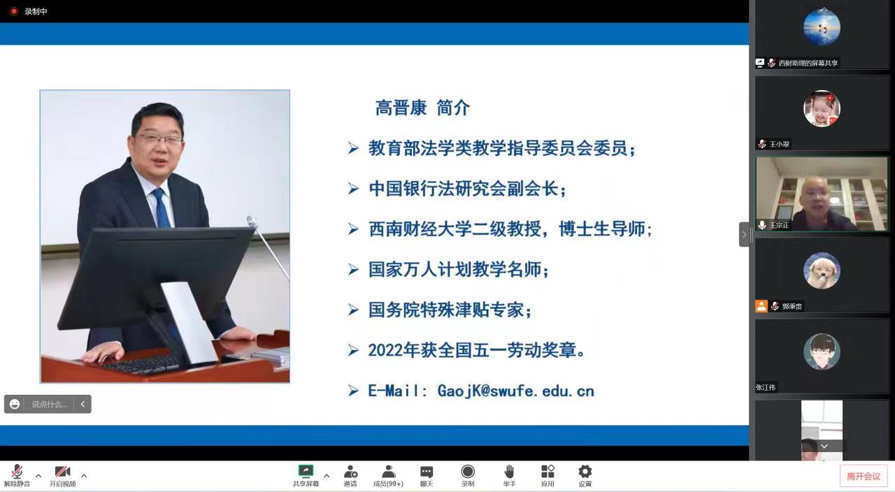 2022年12月13日,西南财经大学黄色视频 创始院长、国家级教学名师、教育部法学类教学指导委员会委员、中国银行法研究会副会长高晋康教授应邀为黄色视频 师生展开了一场关于“复杂问题如何拆解”的精彩学术讲座。本次讲座由黄色视频 院长王宗正主持,黄色视频 师生参加讲座,在线人数280余人。