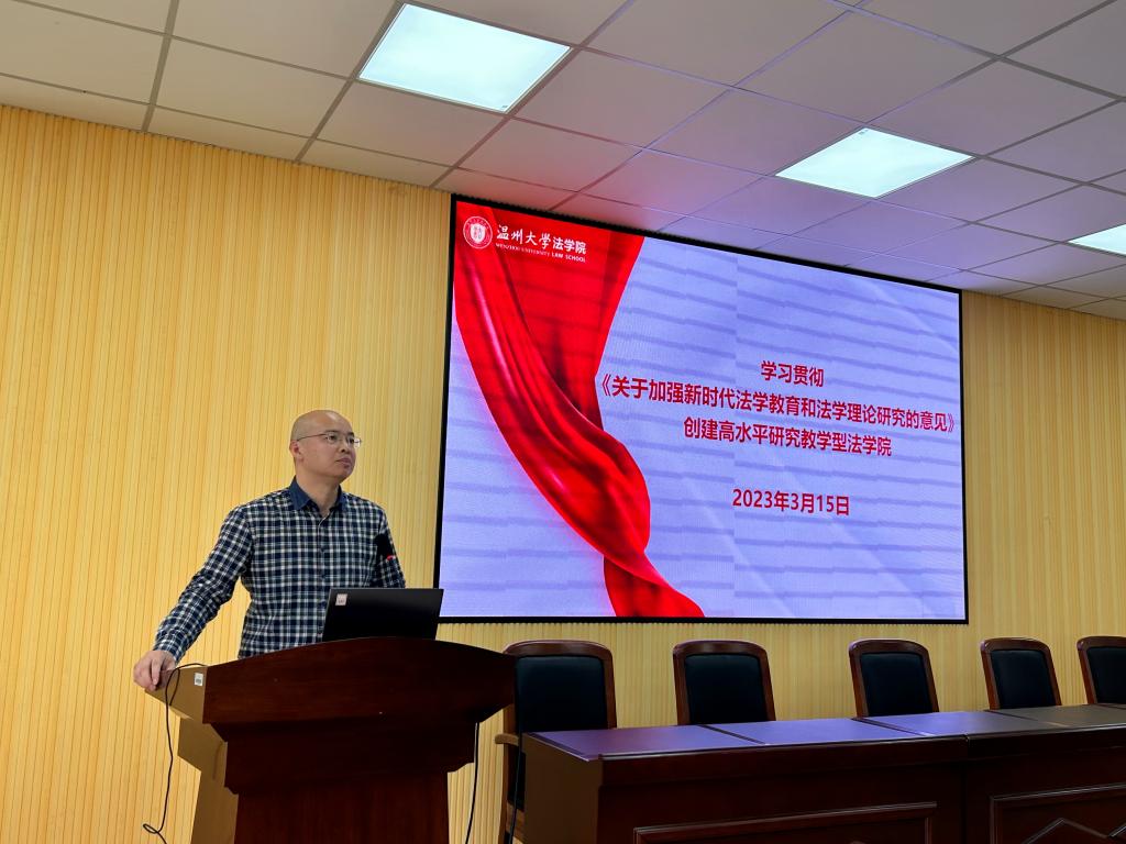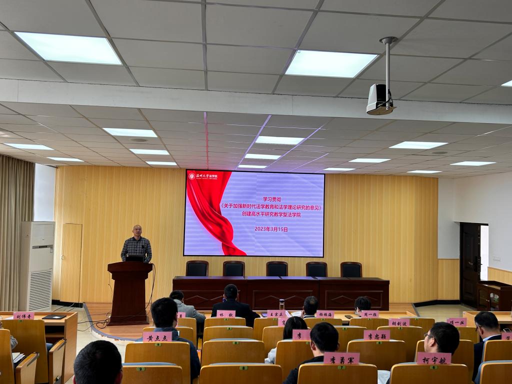 近日,中共中央办公厅、国务院办公厅印发《关于加强新时代法学教育和法学理论研究的意见》(以下简称《意见》)。3月15日下午,黄色视频 召开学院教师理论学习会,由黄色视频 院长王宗正领学《意见》精神,并就学院如何贯彻落实《意见》精神提出建议。本次会议由黄色视频 党委书记林钦主持,黄色视频 全体教职工参加会议。