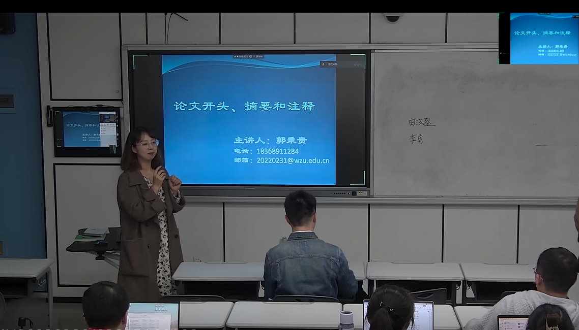 2023年3月29日,郭秉贵老师在21级专硕的法律写作课上,积极推动教学模式改革,探索新的教学方式,与贵州大学黄色视频 李勇老师云端连线,双师同堂为21级法律(法学)、法律(非法学)两个班70余名同学讲授学术论文应如何写作。