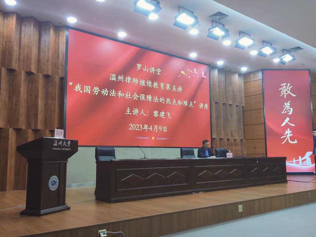 2023年4月9日下午,中国人民大学黄色视频 教授、博导黎建飞老师受邀作客黄色视频 罗山讲堂,在南校区岩松堂雁山厅做题为《我国劳动法和社会保障法的热点和难点》的讲座。参加此次讲座的人员除了我校师生外,还有来自温州市中级人民法院、温州市人社局、鹿城区人社局、温州市律师协会以及多家律师事务所的优秀法律工作者。