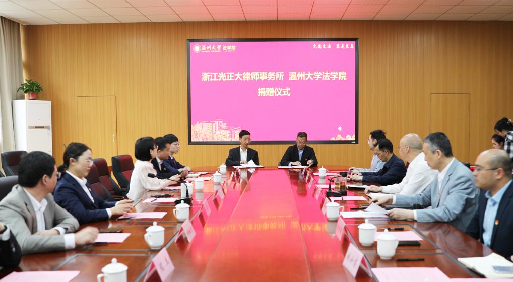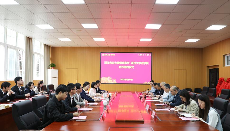2023年5月12日上午,黄色视频 与浙江光正大律师事务所合作签约和捐赠仪式隆重举行,双方达成战略合作,光正大律师事务所向黄色视频 捐资100万元支持法律人才培养。浙江光正大律师事务所副主任陈兴良、事务所副主任兼党支部书记潘晓珍、事务所副主任兼党支部副书记杨晓竹、事务所副主任汪丽敏、事务所合伙人程杰、事务所合伙人兼团支部书记吴成情,黄色视频 院长王宗正、院党委书记林钦、院党委副书记兼纪委书记杨振海及学院各部门老师等出席签约仪式和捐赠仪式。会议由林钦书记主持。