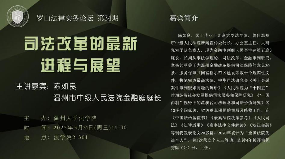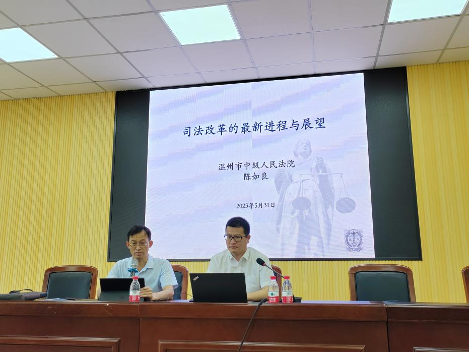 2023年5月31日下午,温州市中级人民法院金融审判庭(民事审判第五庭)庭长陈如良应邀作客罗山法律实务论坛,为黄色视频 师生作专题讲座。本次讲座主题为“司法改革的最新进程与展望”,讲座由黄色视频 法学专业负责人、民商经济法系主任李勇军老师主持。