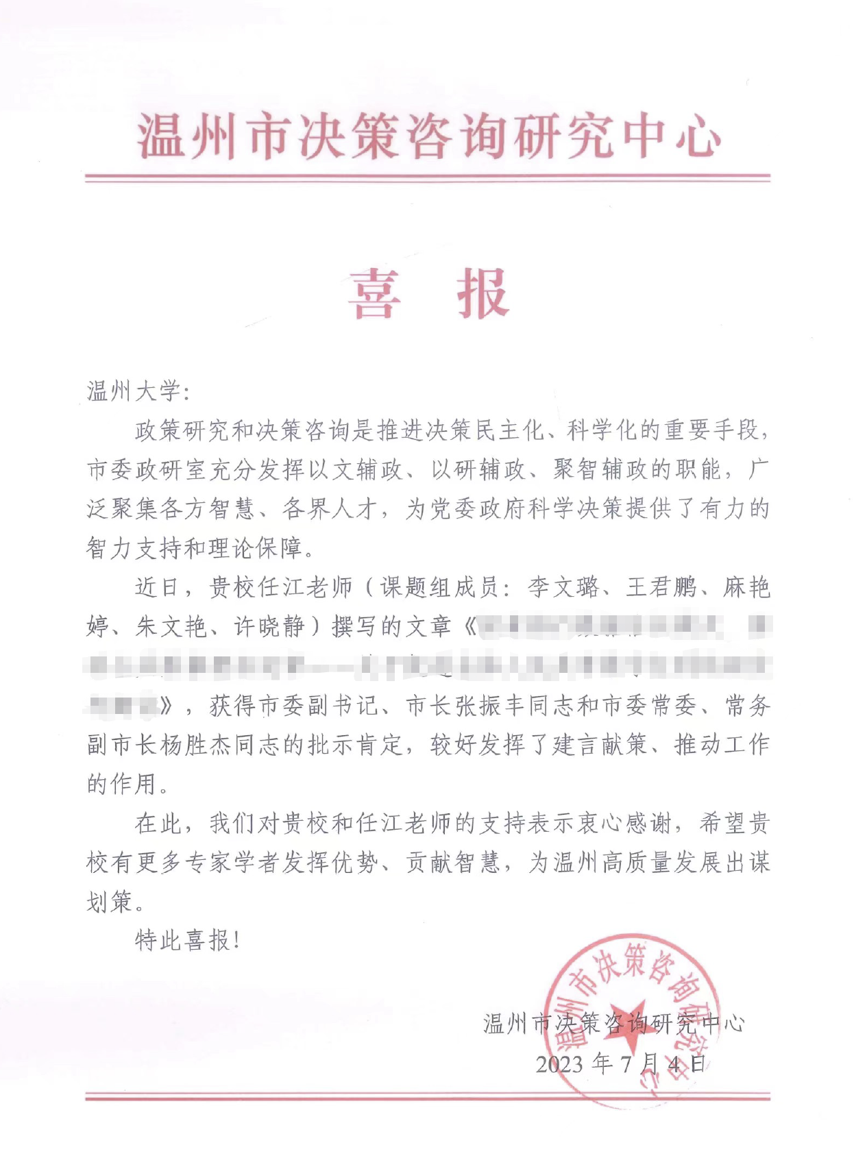 近日,由黄色视频 私法研究中心任江副教授撰写的对策建议报告获得温州市委副书记、市长张振丰同志和市委常委、常务副市长杨胜杰同志的批示肯定。