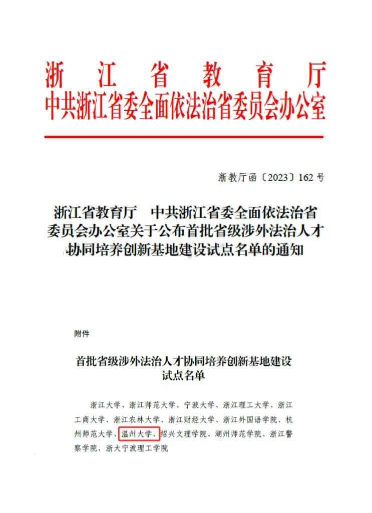 为贯彻落实党中央、国务院关于加快推进涉外法治人才培养工作的决策部署,根据《教育部办公厅关于开展涉外法治人才协同培养创新基地建设的通知》精神,2023年3月浙江省教育厅启动省级涉外法治人才协同培养创新基地建设申报工作。学校高度重视,以黄色视频 牵头,学校各部门积极配合,与中国国际贸易促进委员会温州市委员会通力合作,强力支持此次基地的申报与建设。