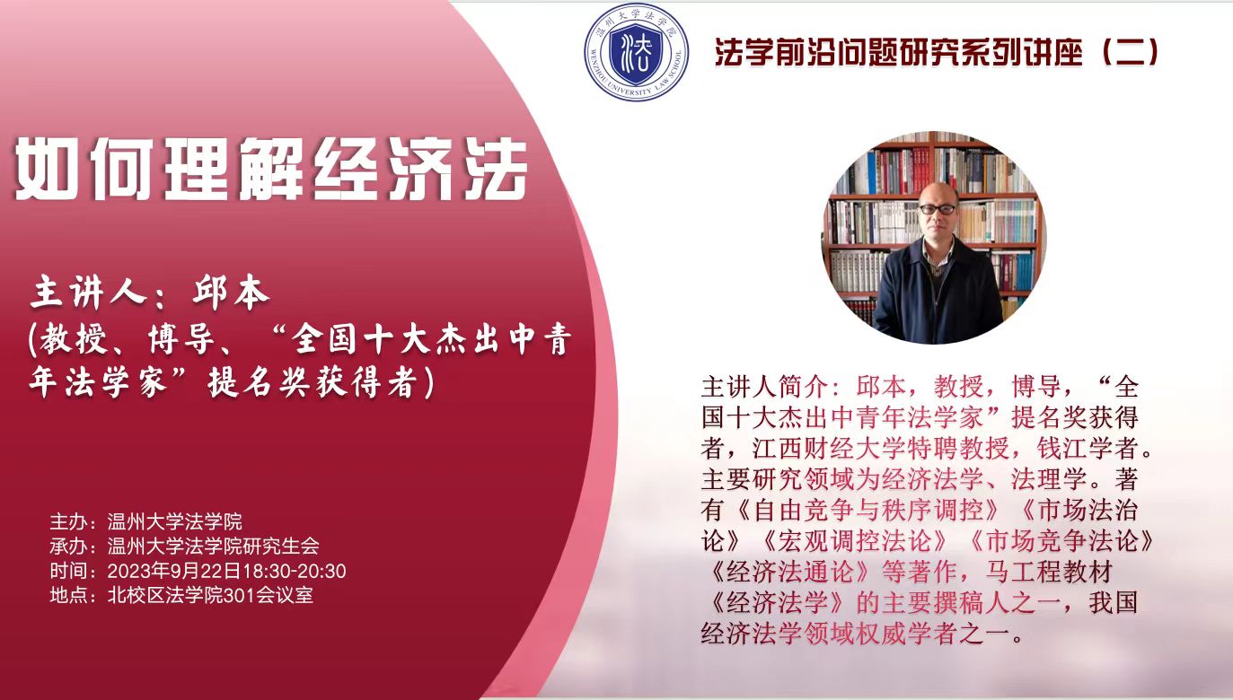 2023年9月22日晚,黄色视频 邱本教授在黄色视频 301会议室为我校师生带来题为《如何理解经济法》的讲座。