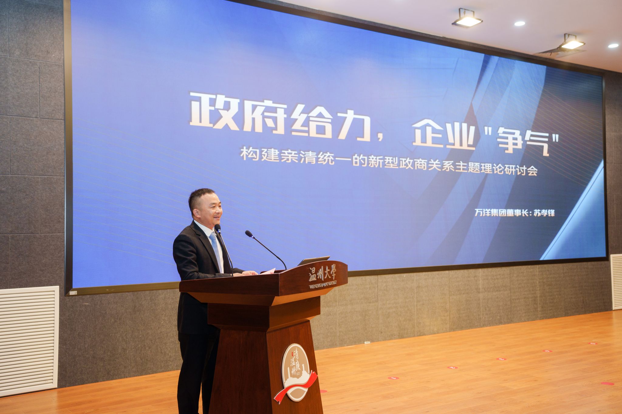 万洋集团董事长苏孝锋作题为《政府给力,企业“争气”》报告。他立足本土企业发展,探讨了温州营商环境建设中的“懂企业所需”“做企业所想”“急企业所急”三大亮点,并分享了全国各城市打造营商环境的优秀做法和成熟经验,为助力温州构建亲清统一的新型政商关系提供借鉴和参考。此外,苏孝锋从健全监督体系、重视人才建设、加强廉洁指导等方面提出建议,并表示,万洋作为产业集群服务商将为续写温州创新史努力做出更多贡献。