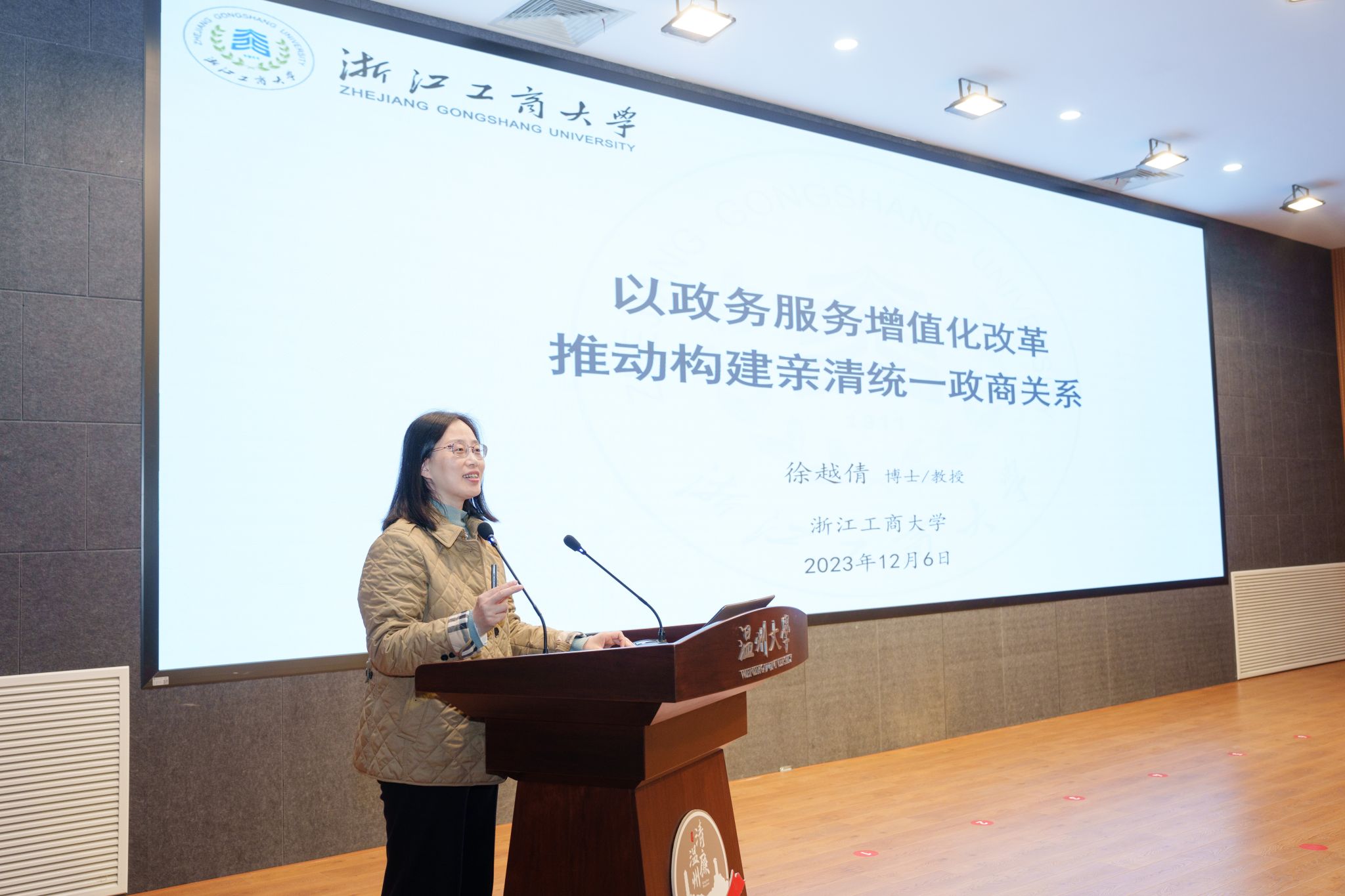 在主旨演讲环节,浙江工商大学公共管理学院教授徐越倩作题为《以政务服务增值化改革推动构建亲清统一政商关系》报告。徐越倩教授剖析了以政府服务增值化改革推动构建亲清统一政商关系的实践逻辑与探索过程。她强调,在实践探索中应当对政企之间的“亲近”与“清廉”问题给予充分回应,同时还要处理好 “优质服务”与“有效监管”、政府服务“集成”与“分布”、“审批效率”与“决策增值”以及“政府主导”与“多元参与”等关系。