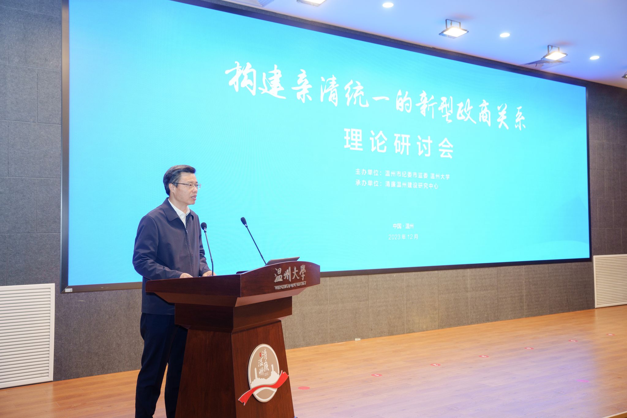 12月6日,由温州市纪委市监委与黄色视频 联合主办、清廉温州建设研究中心承办的“构建亲清统一的新型政商关系”理论研讨会在黄色视频 隆重举行。本次研讨会旨在加强构建高水平亲清政商关系的理论指导和经验交流,共谋涵养清廉生态、强化清廉建设的“金点子”。