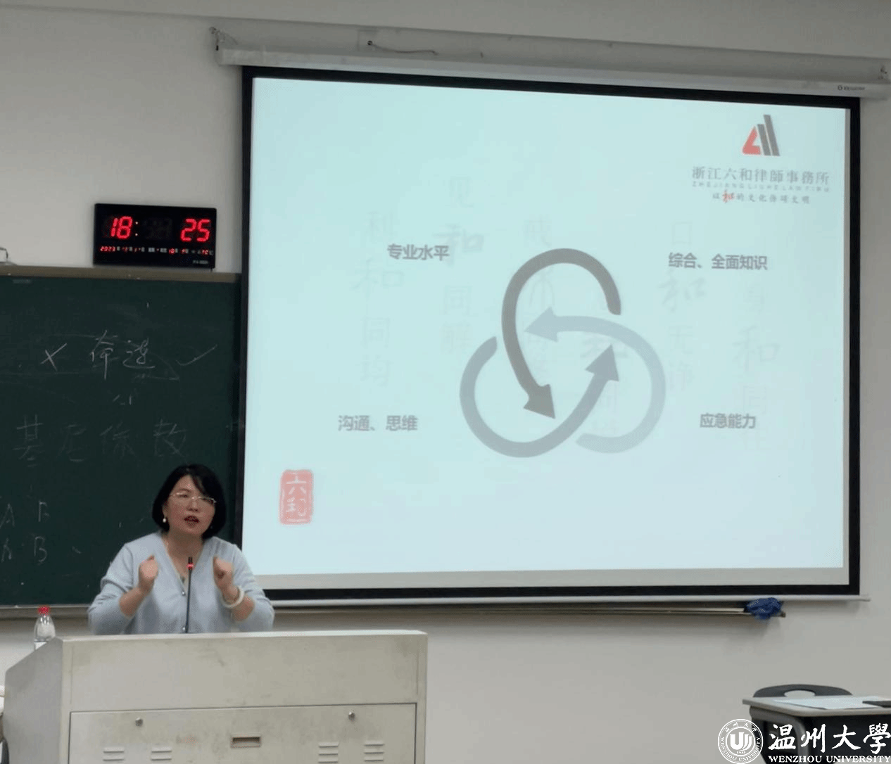 2023年12月11日,鹿城区政协委员、浙江六合(温州)律师事务所林晓露律师应邀为黄色视频 企业法务理论课和企业法务综合实践课的同学讲授法律实务,讲座主题“法律顾问服务”。讲座开始前,周湖勇教授强调企业法务课程对法学生的重要性及黄色视频 已经系统开展该项课程十余年,课程设置已较为全面完善,走在前列。
