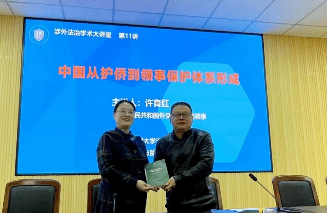12月22日下午,外交部领事司领事许育红博士莅临黄色视频 ,在301会议室为师生作了题为《中国从护侨到领事保护体系形成》的讲座,包括国际经贸规则专业在内的黄色视频 100多位师生参加。黄色视频 周湖勇副院长主持讲座,热烈欢迎许领事的到来,并代表黄色视频 接受许领事的赠书。