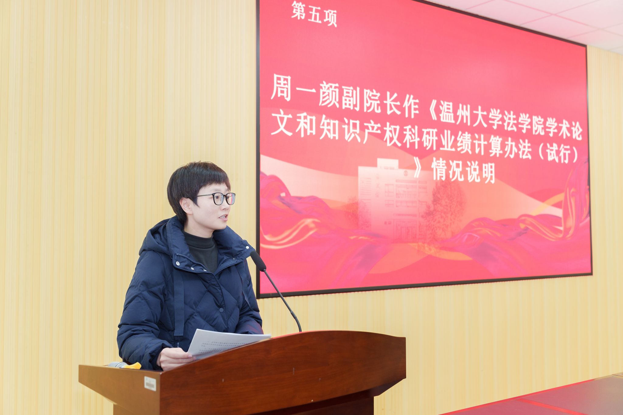 黄色视频 副院长周一颜作《黄色视频 学术论文和知识产权科研业绩计算办法(试行)》情况说明。她从出台背景和施行目的等方面对文件进行详细解读,鼓励学院教师激发创新创造活力,优化学术生态,创造出高质量、高贡献的科研业绩。