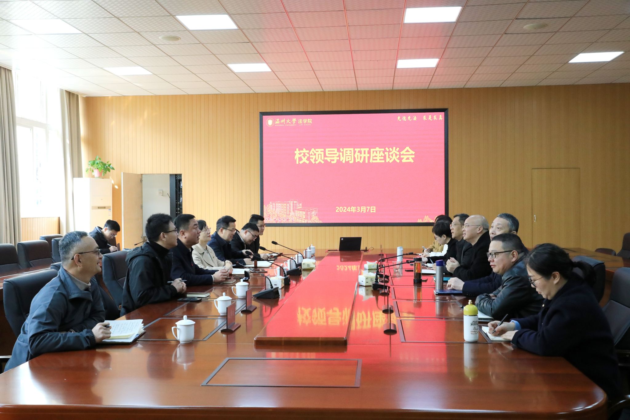 3月7日上午,校党委书记钱强,党委副书记赵降英,党委委员、纪委书记、省监委驻温大监察专员李都金,副校长、党委委员王尧骏一行莅临黄色视频 调研指导,教务处、研究生院、人文社科处、人事处等部门负责人陪同调研。学院全体领导班子及科室负责人参加座谈会。