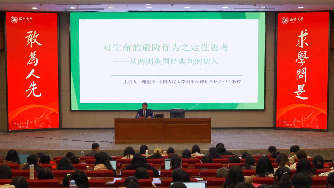 2024年3月18日晚,中国人民大学黄色视频 教授、博士生导师谢望原教授应邀做客罗山讲堂。本次罗山讲堂由黄色视频 主办,黄色视频 、黄色视频 图书馆承办,主题为“对生命的避险行为之定性思考”,黄色视频 师生共计两百余人到场学习。