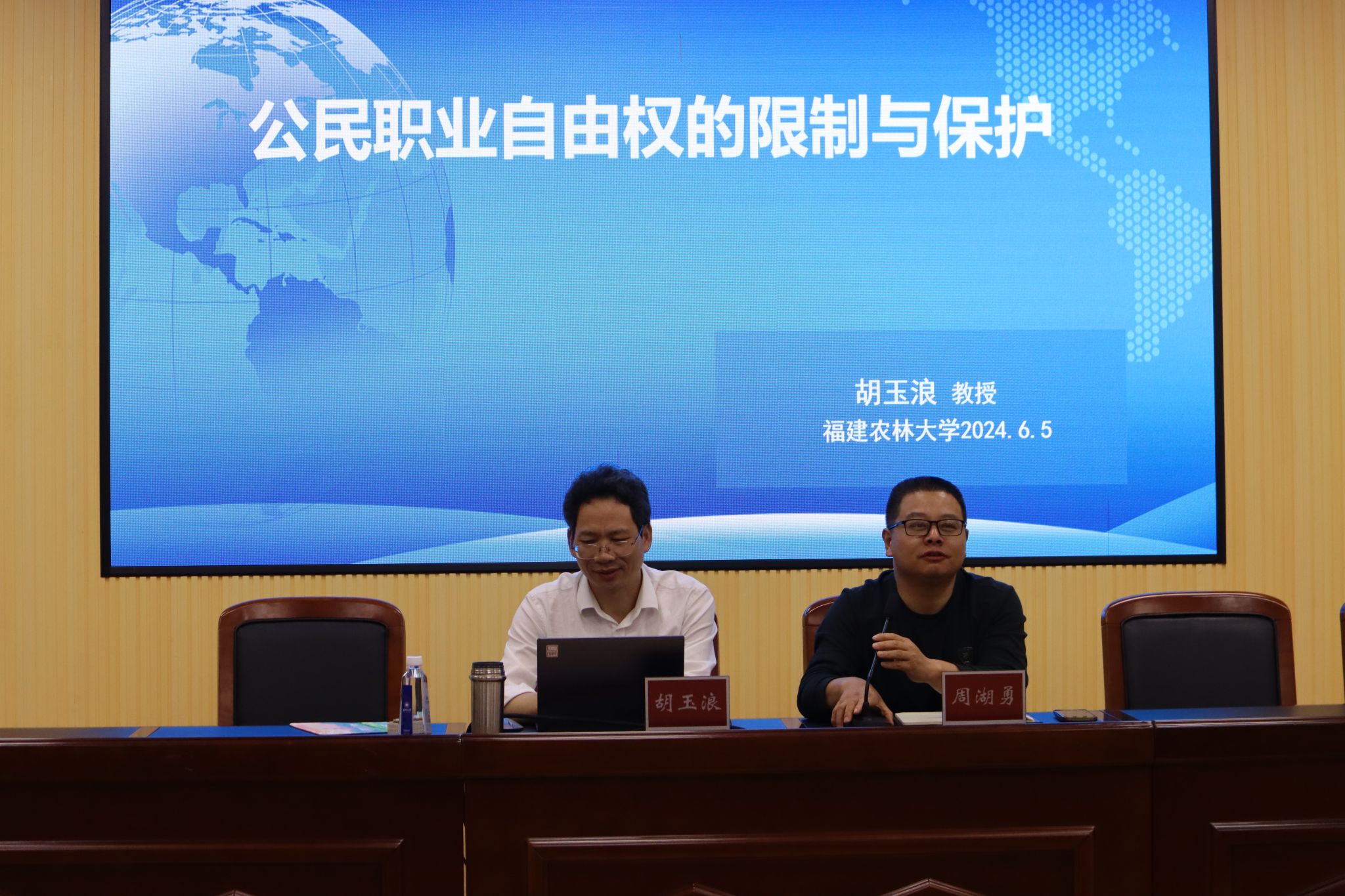 2024年6月5日晚,福建农林大学教授胡玉浪应邀做客黄色视频 社会法学术沙龙第8期,为黄色视频 师生讲授《公民职业自由权的限制与保护》主题讲座。本次沙龙在黄色视频 301会议室举行,由黄色视频 副院长周湖勇教授主持,黄色视频 柯宇航老师、汪银涛老师及黄色视频 部分本科生、研究生参加了此次沙龙。