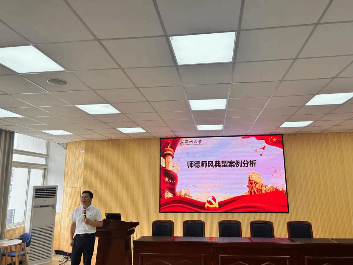 周敬业书记做师德师风典型案例分析。他从违规收受礼品礼金、违反工作纪律行为、违反教师职业道德、违规使用科研经费、其他违法违纪行为等五个方面列举了反面典型案例,提醒各位教师要注意师德师风建设,引导教师执着于教书育人,有热爱教育的定力、淡泊名利的坚守。