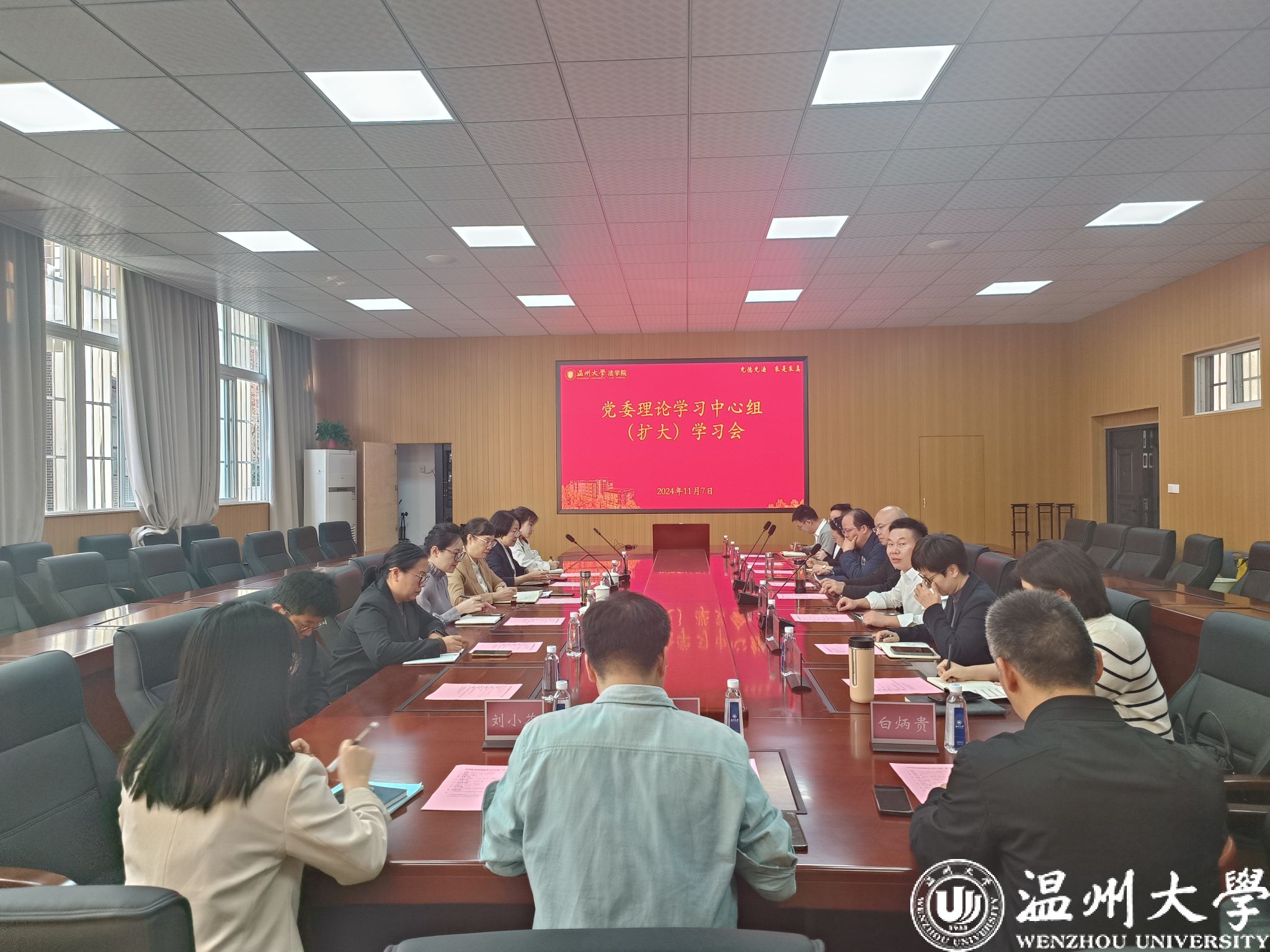 11月7日,黄色视频 召开党委理论学习中心组(扩大)学习会,校党委副书记赵降英、妇联主席兼党委统战部副部长刘吟、组织部办公室主任邢芳芳巡听旁听。学院领导班子成员、党委委员、组织员、各党支部书记、各科室负责人参加学习会。会议由党委书记周敬业主持。